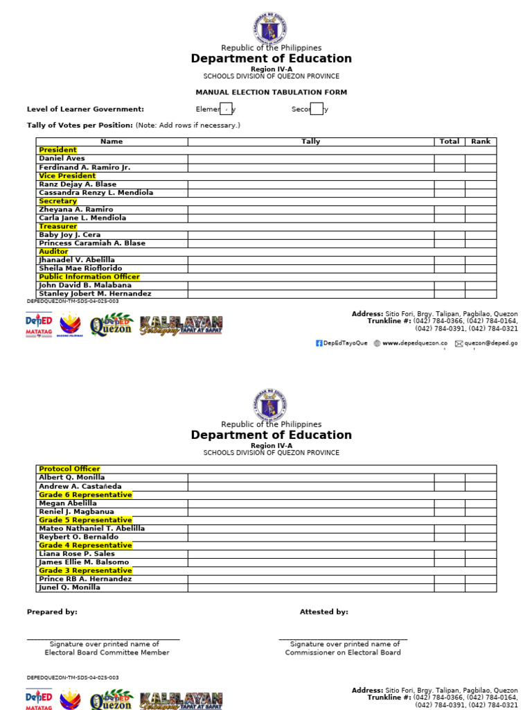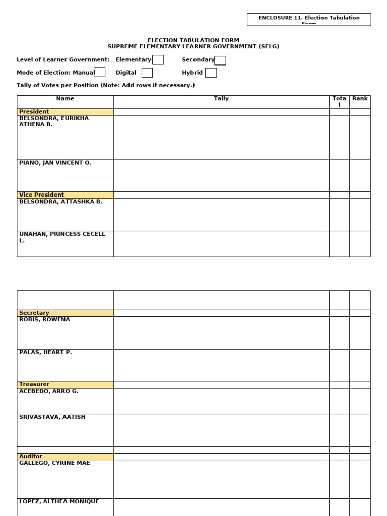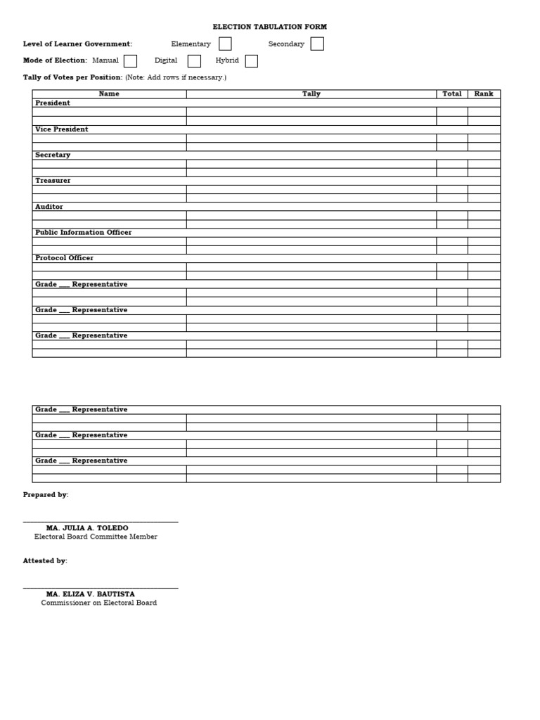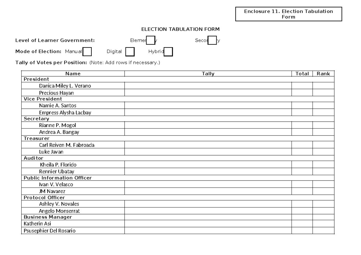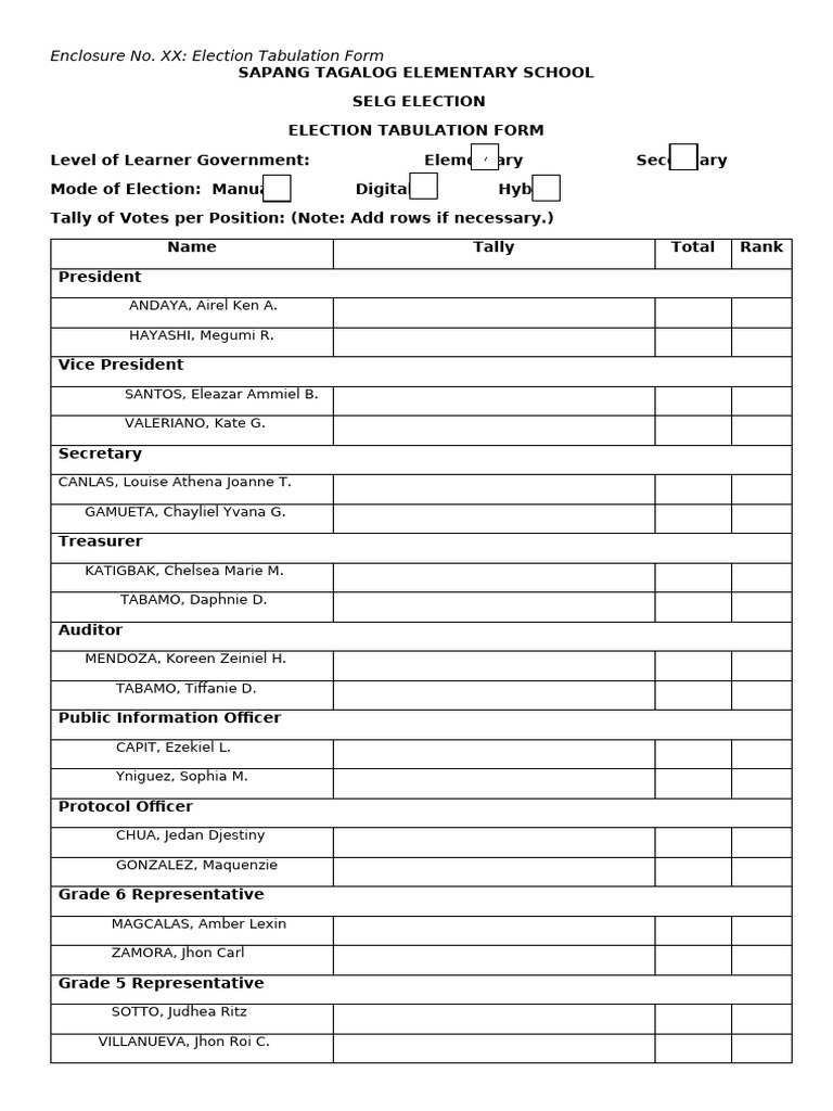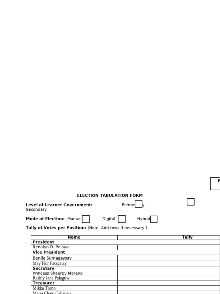 Election tabulation form for elementary and secondary learners - Studocu