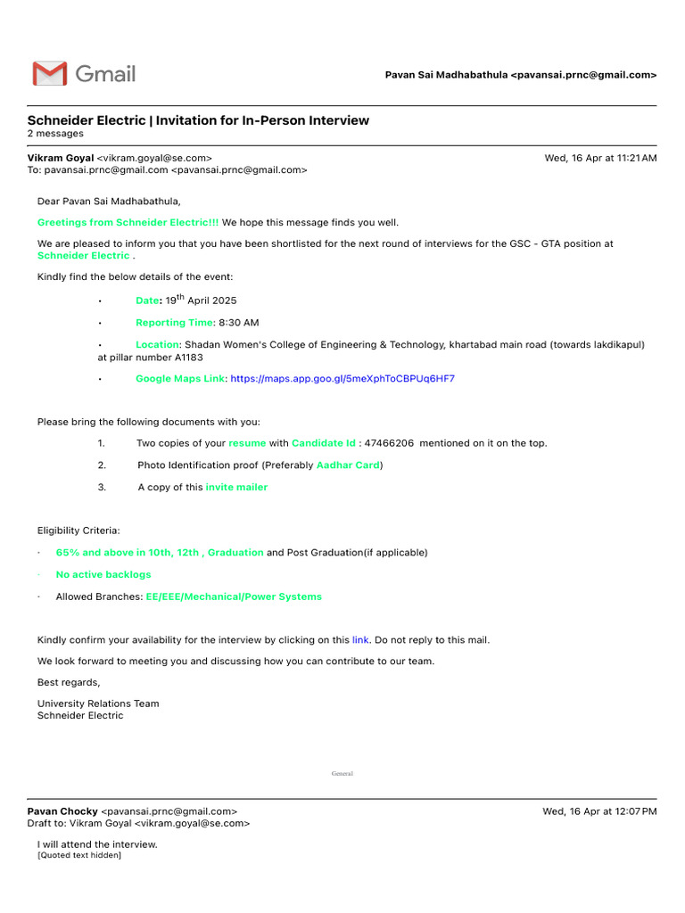 Schneider Electric - Invitation For In-Person Interview | PDF