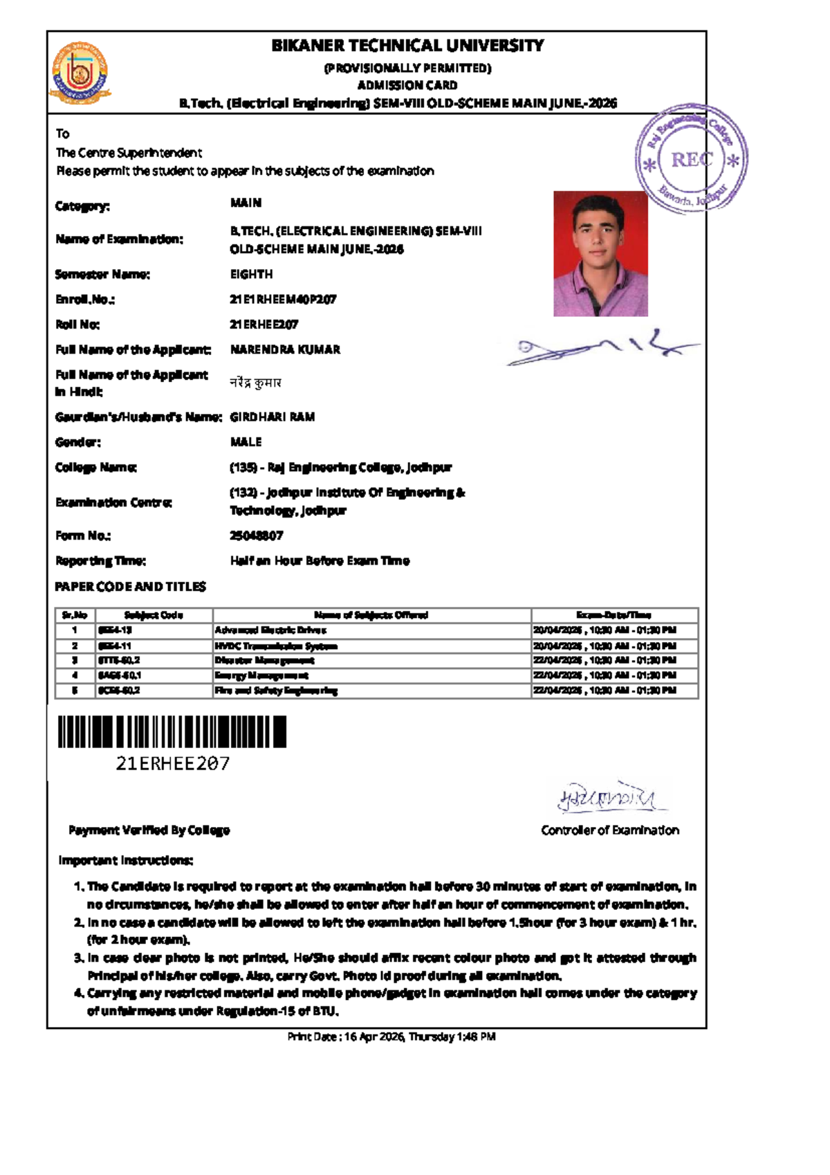 B.Tech. (Electrical Engineering) 8th Sem Main Exam Admit Card - Studocu