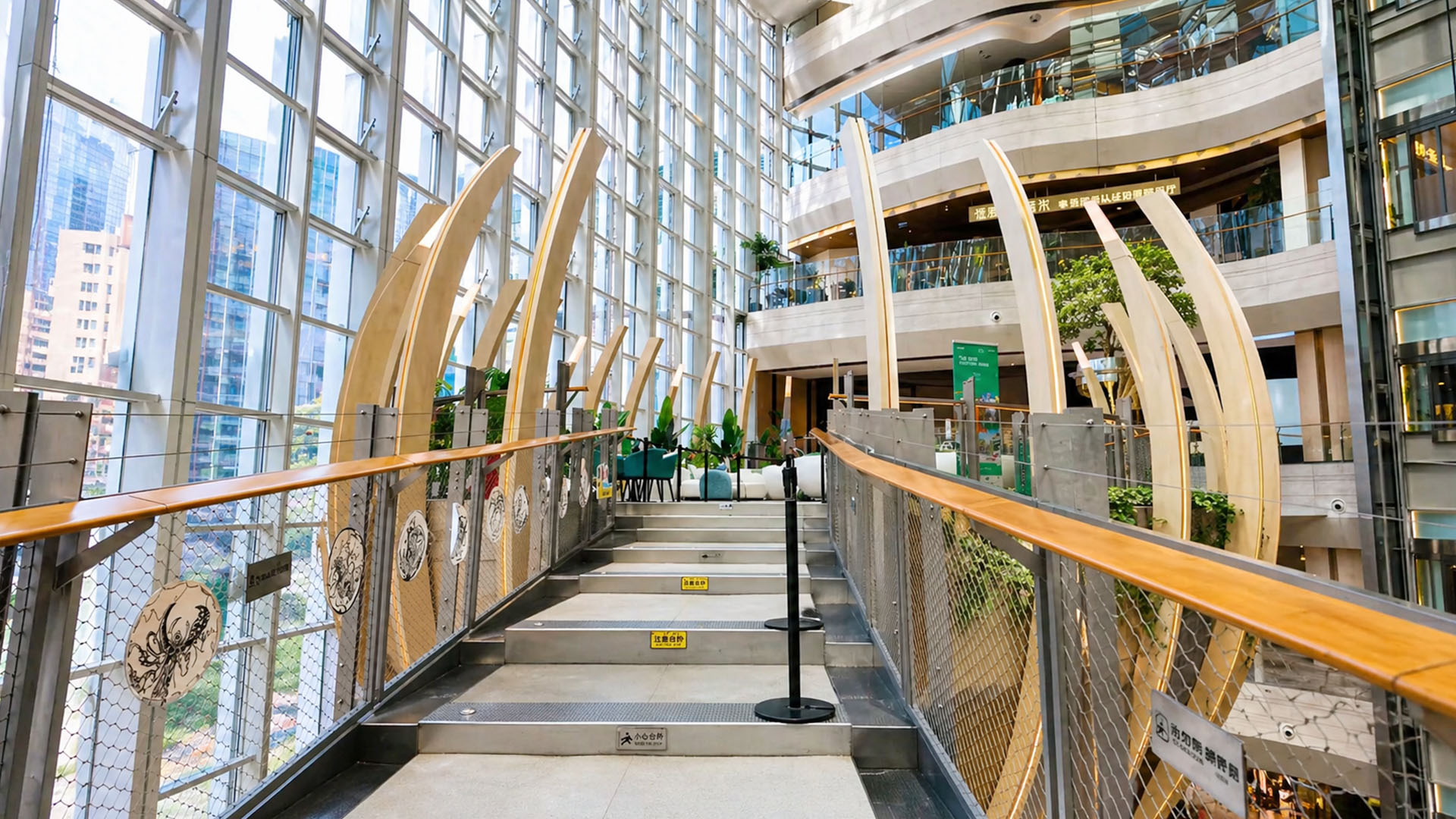 "A large, circular, metal-framed glass dome structure with multiple ...