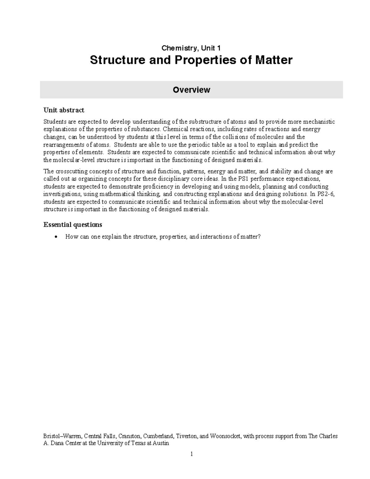HS Chemistry Unit 1: Structure and Properties of Matter Overview - Studocu