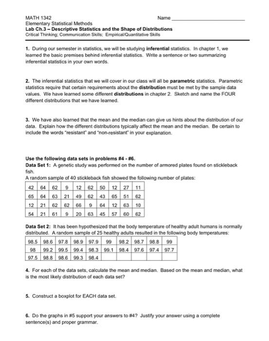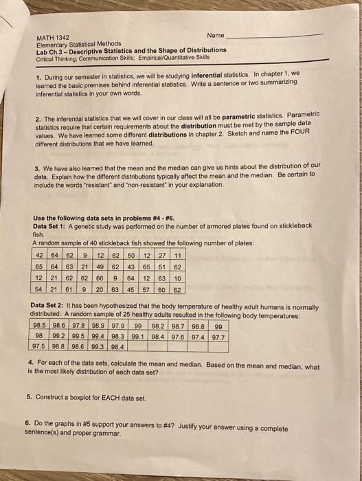 Solved: MATH 1342 Name Elementary Statistical Methods Lab ... | Chegg.com