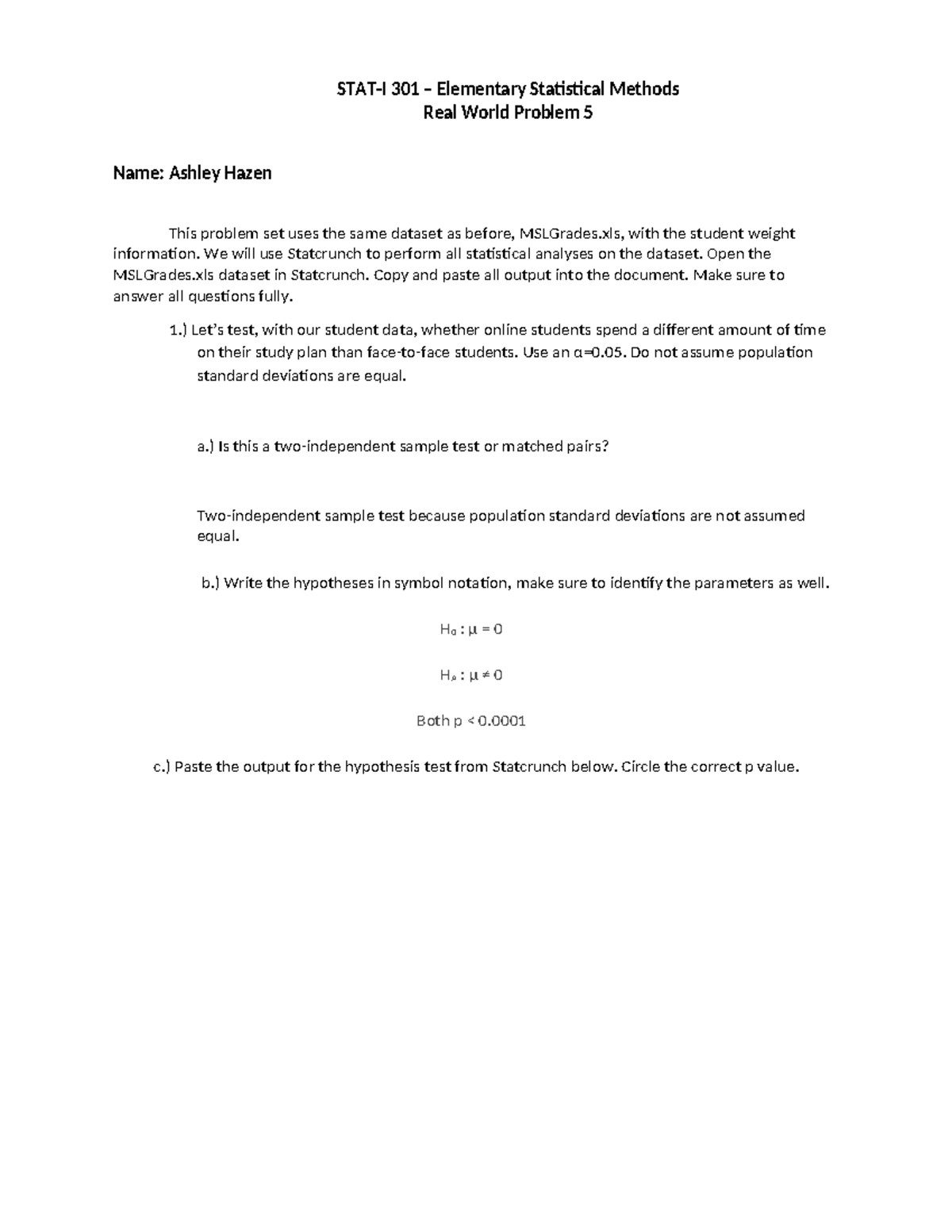301 Elementary Statistical Methods: Real World Problem Set 5 - Studocu