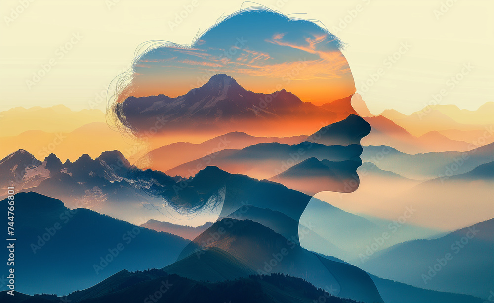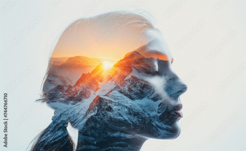 Elevated Unity: Woman's Face Over Sunset Mountains in Double Exposure ...