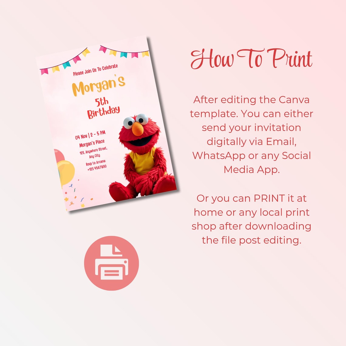 Elmo Editable Birthday Invitation Canva Editable-printable Instant ...