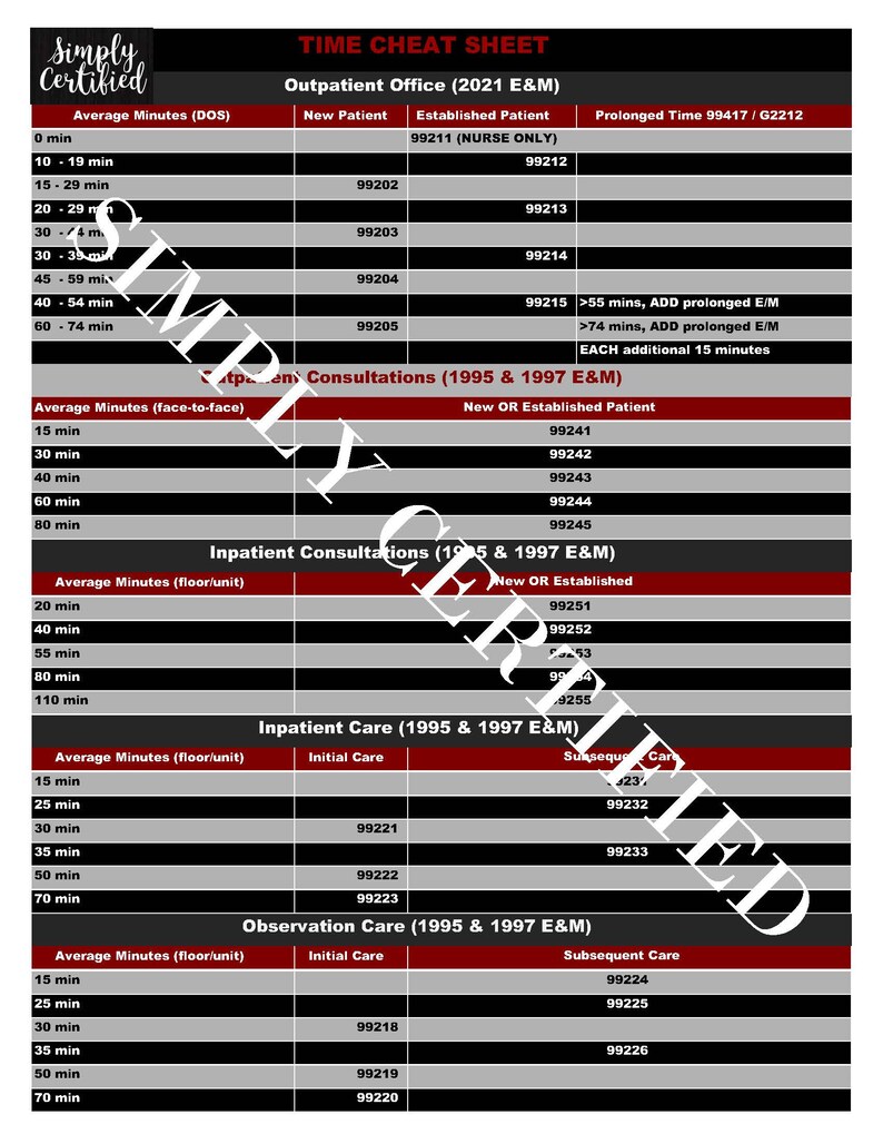 95, 97 and 21 E&M Time-based Coding Cheat Sheet in Black and Red - 2021 ...