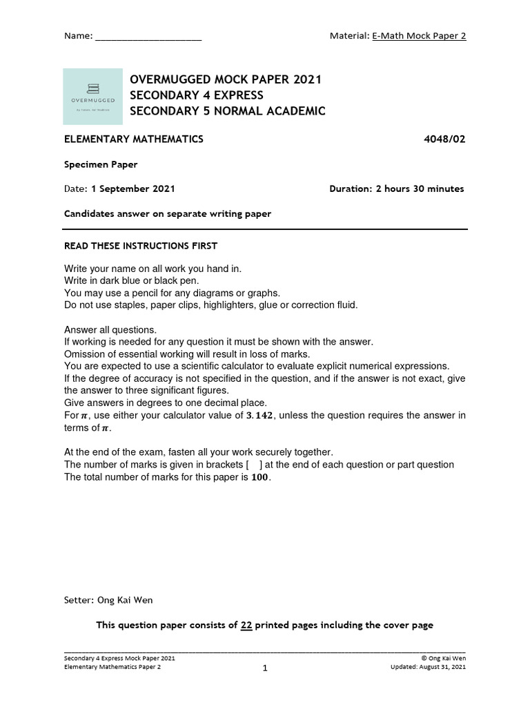 2024 Secondary 4 Sec 4 G3 Express Elementary Mathematics EMath Math ...