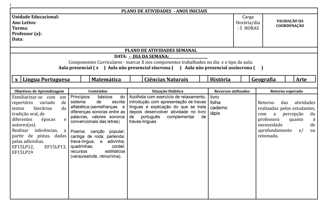 Plano de aula para imprimir gratuito embasado pelas diretrizes do MEC ...