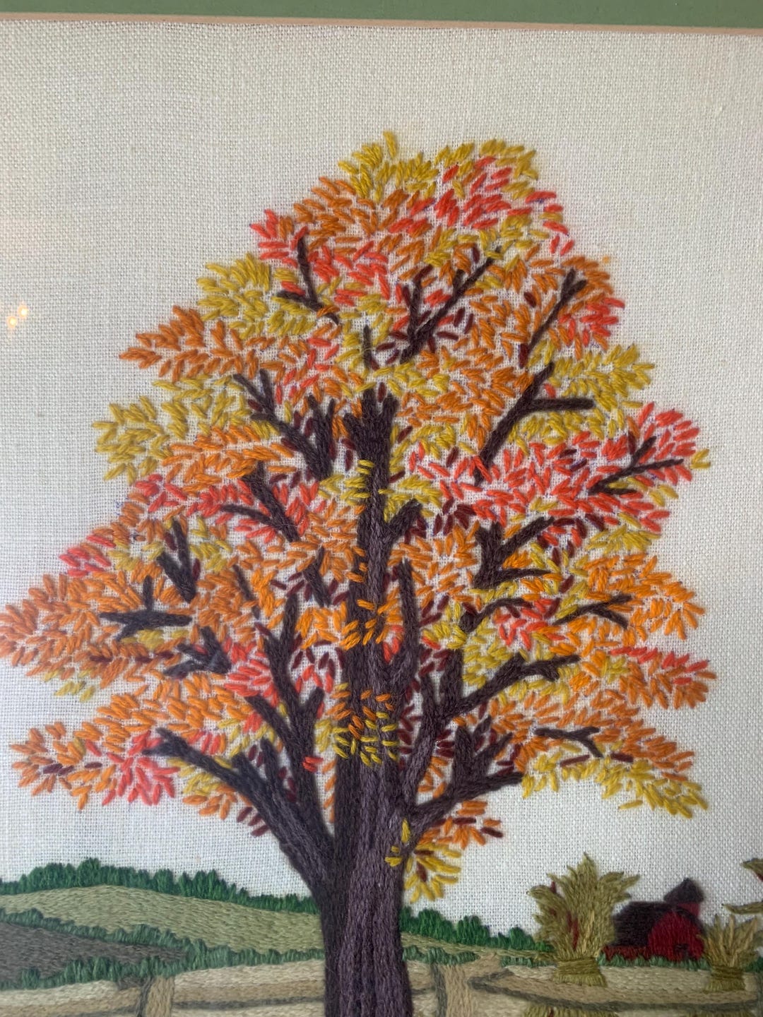 Vintage Crewel Embroidery Wall Hanging – Autumn Landscape With Tree ...