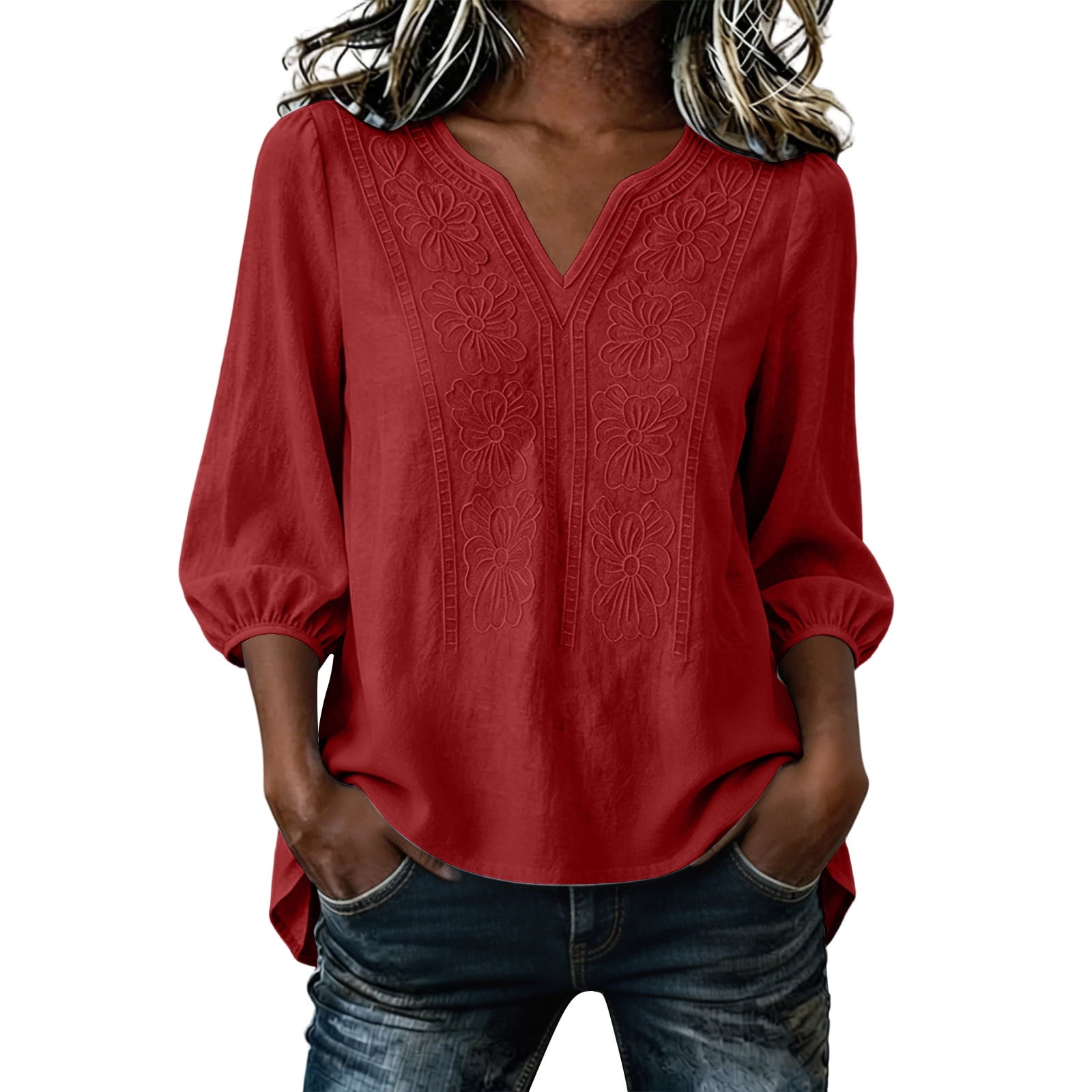 Ounisa Shirts for Women Embroidery 3/4 Sleeve V-neck Floral Flower ...