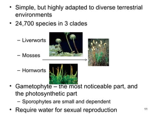 liverworts. Like mosses and hornworts, they have a gametophyte-dominant ...