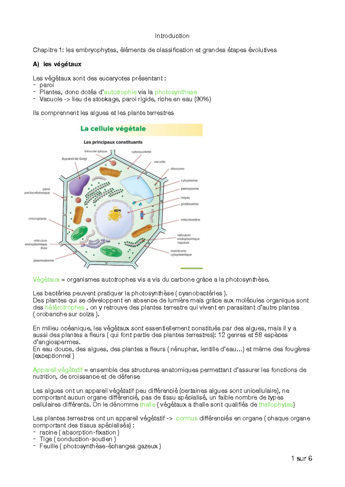 Bio Végétale - Chapitre 1: Embryophytes et Évolution - Studocu