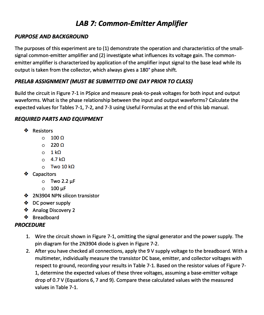 Solved LAB 7: Common-Emitter Amplifier PURPOSE AND | Chegg.com