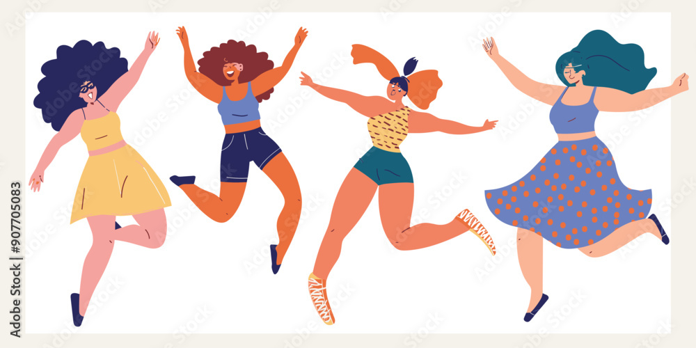 Four diverse women joyfully jumping, expressing happiness freedom ...