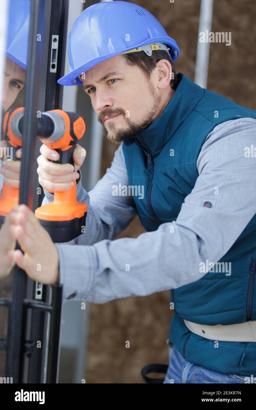 workman using cordless screwdriver on door lock Stock Photo - Alamy