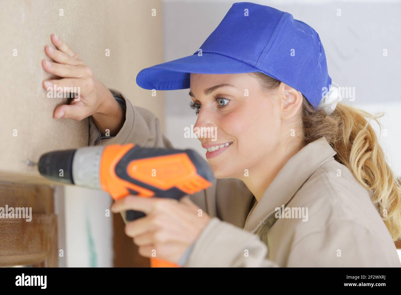 beautiful professional female worker using cordless screwdriver Stock ...