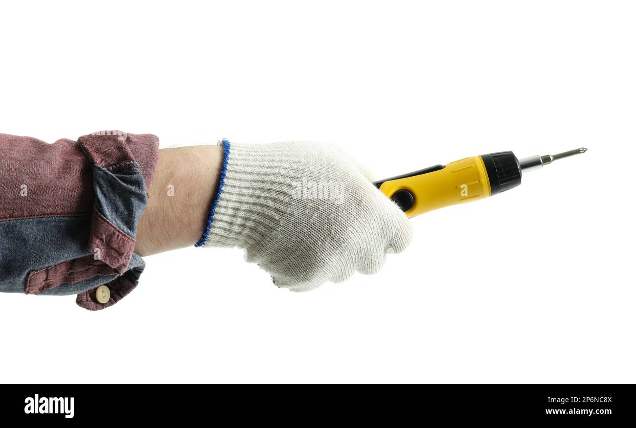 Worker with screwdriver on white background Stock Photo - Alamy