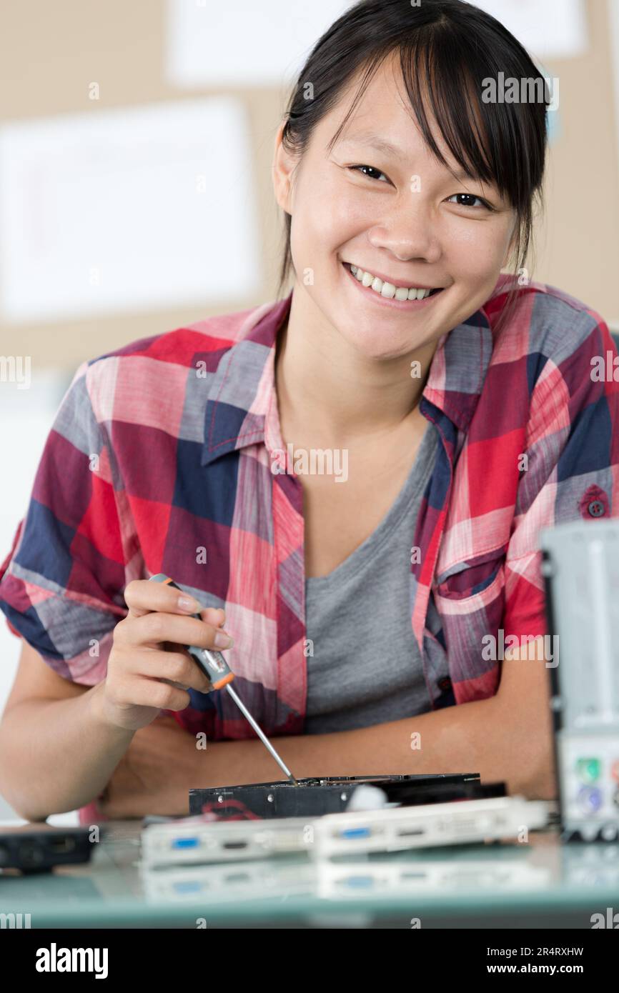 young woman using screwdriver while working on computer component Stock ...