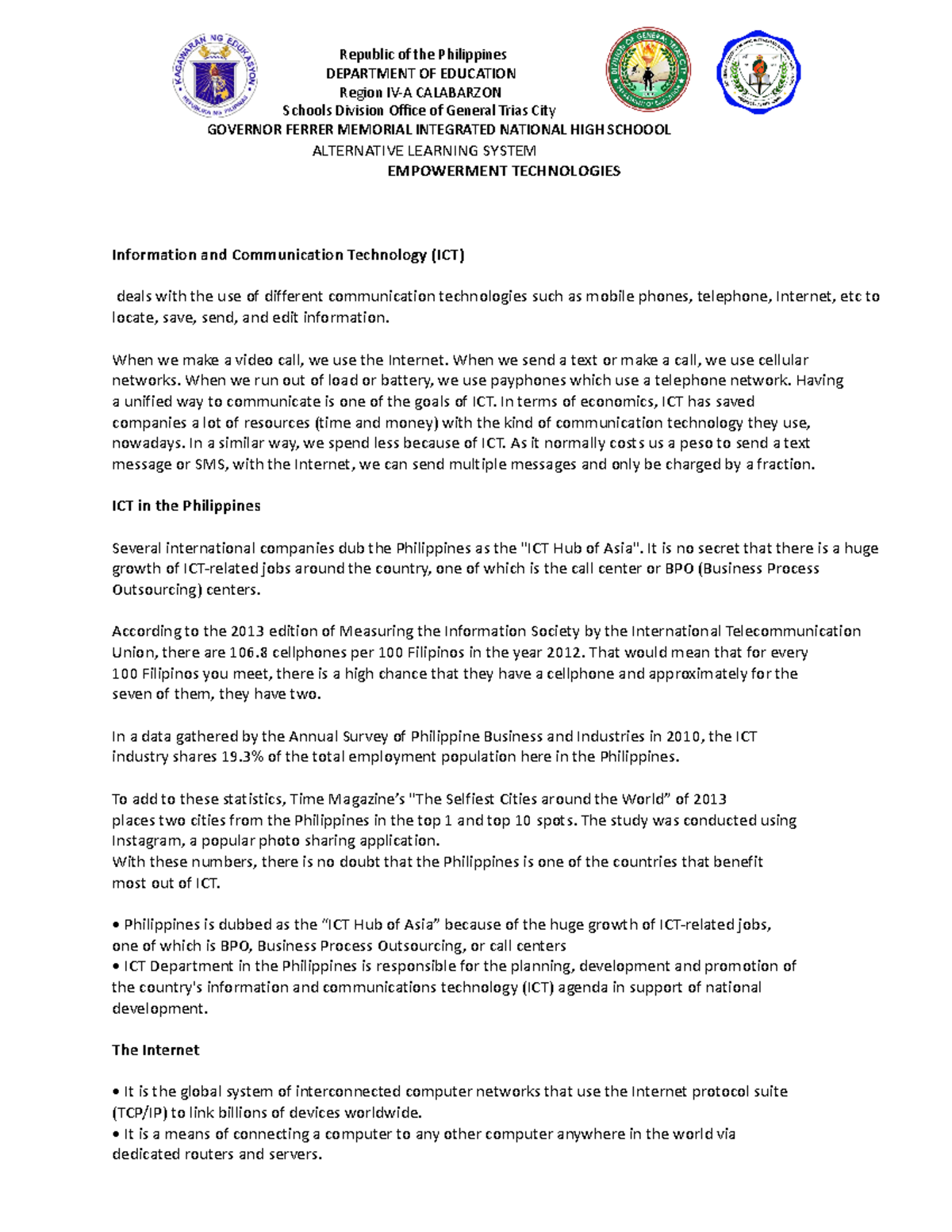 Empowerment Technology 1 - EMPTECH (reviewer) THE CURRENT STATE OF ICT ...
