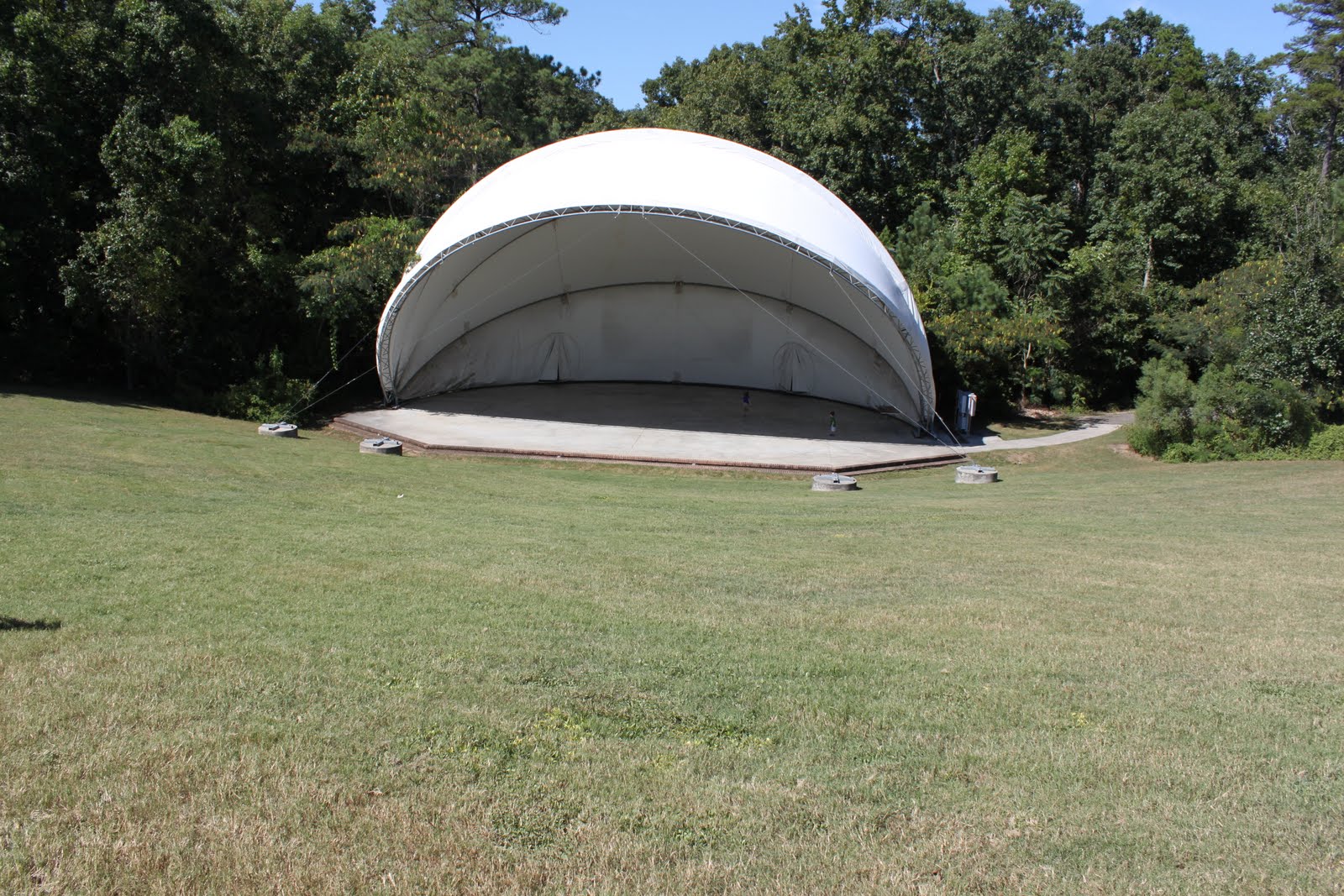 Empty outdoor amphitheater stage surrounded by lush green tr