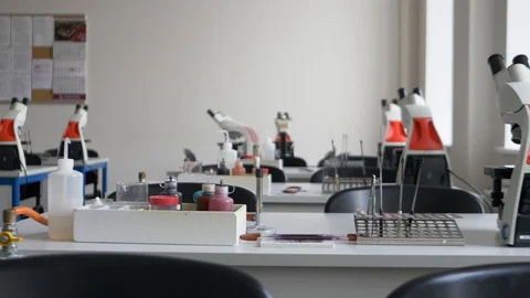 steady shoot of empty laboratory tables ... | Stock Video | Pond5