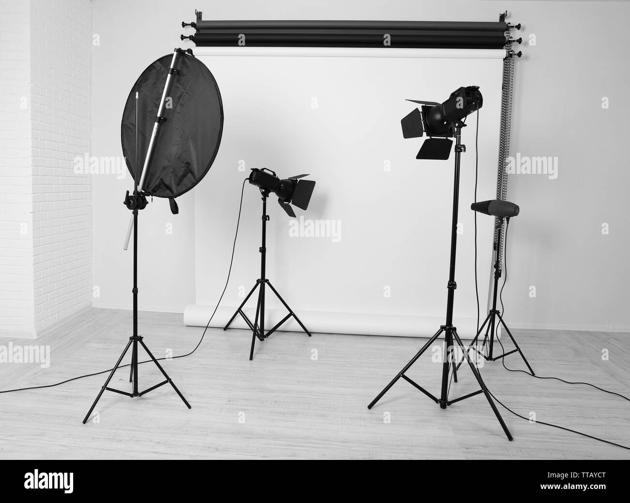 Empty photo studio with lighting equipment. Photographer workplace ...