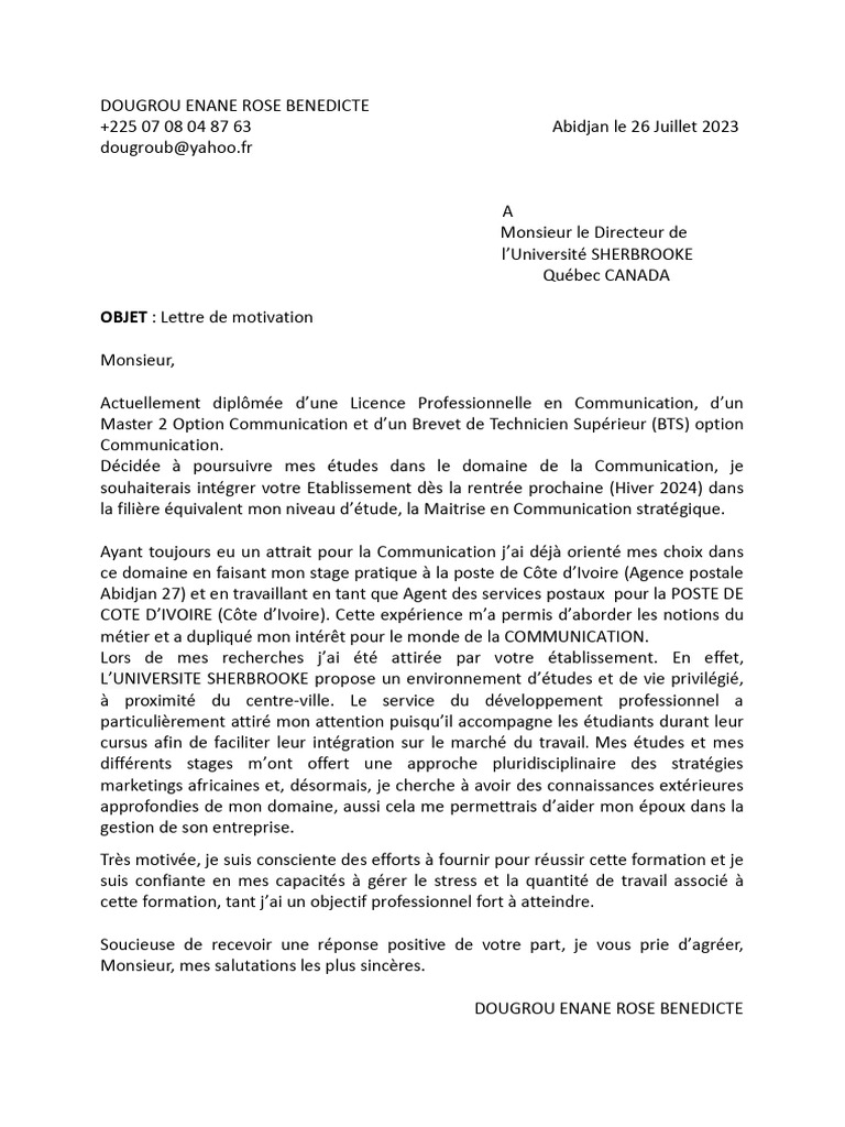 Lettre de Motivation Dougrou Enane Rose Benedicte | PDF | Évolution de ...