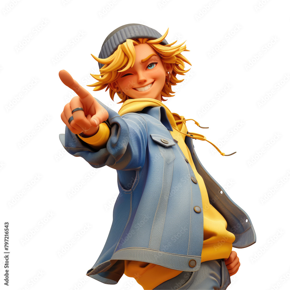 A cheerful blonde cartoon man dressed in a denim shirt hoodie and ...