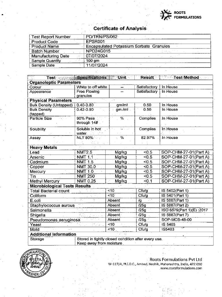 COA Encapsu. Potassium Sorbate Granules | PDF