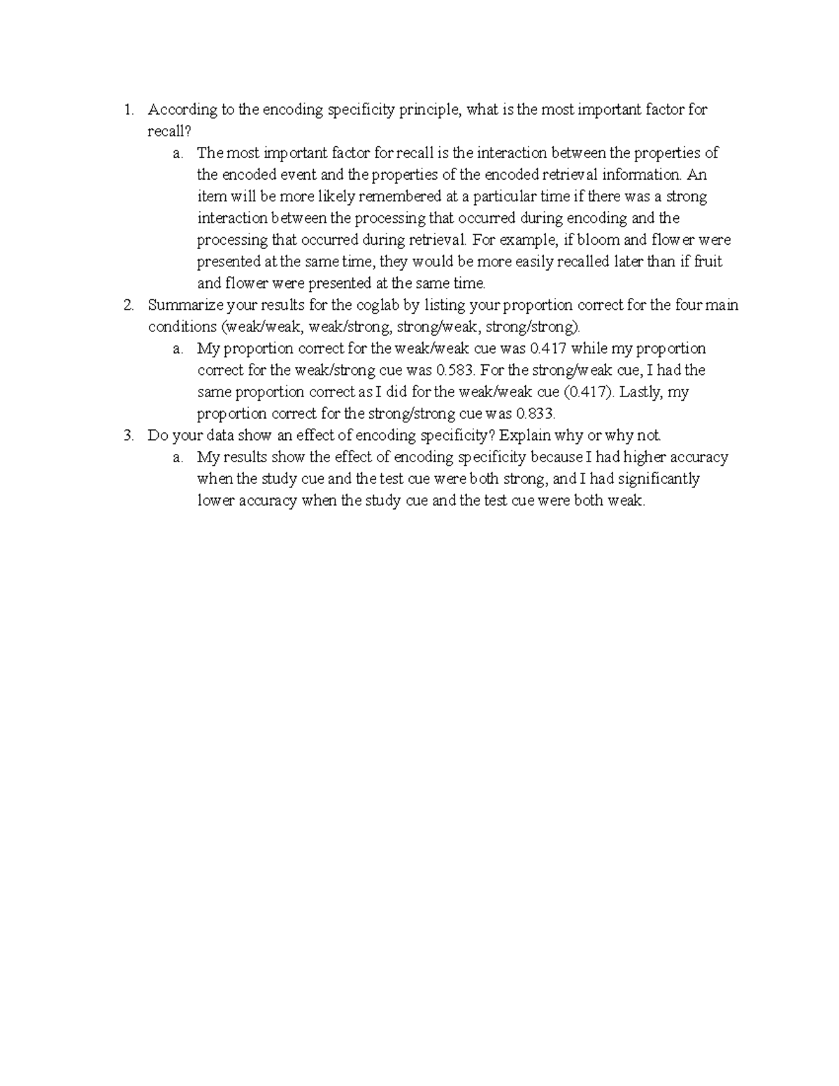 CogLab Results on Encoding Specificity: Response Analysis - Studocu