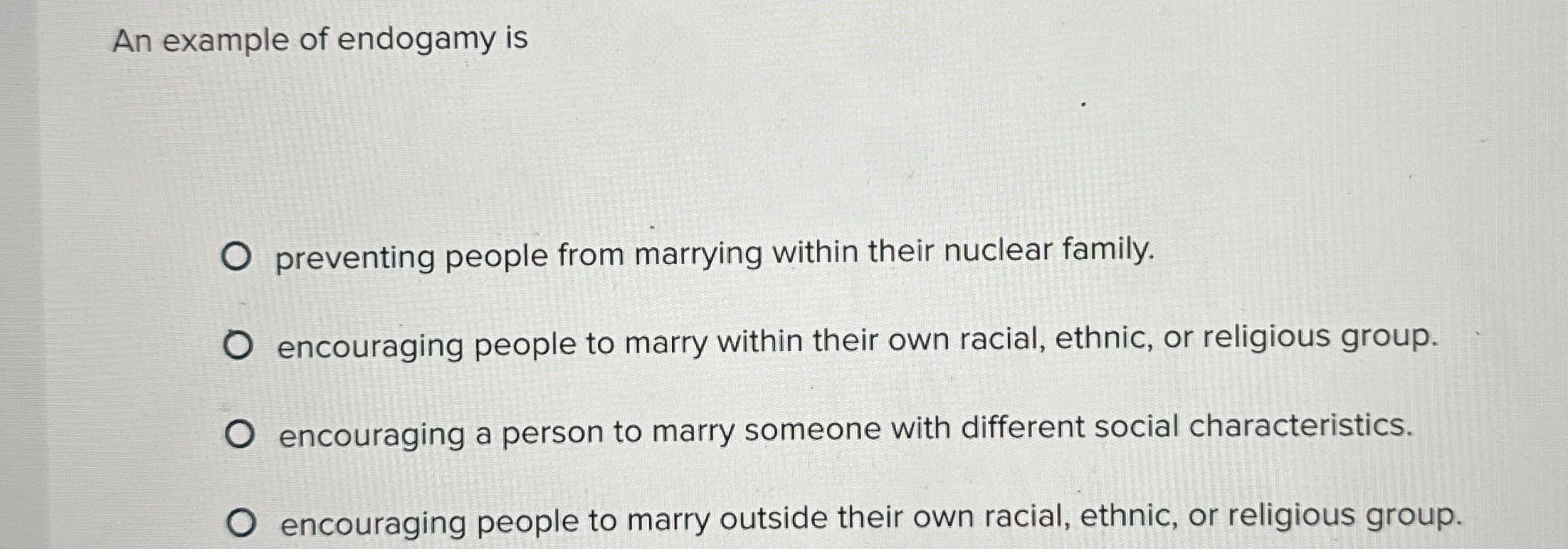 Solved An example of endogamy ispreventing people from | Chegg.com
