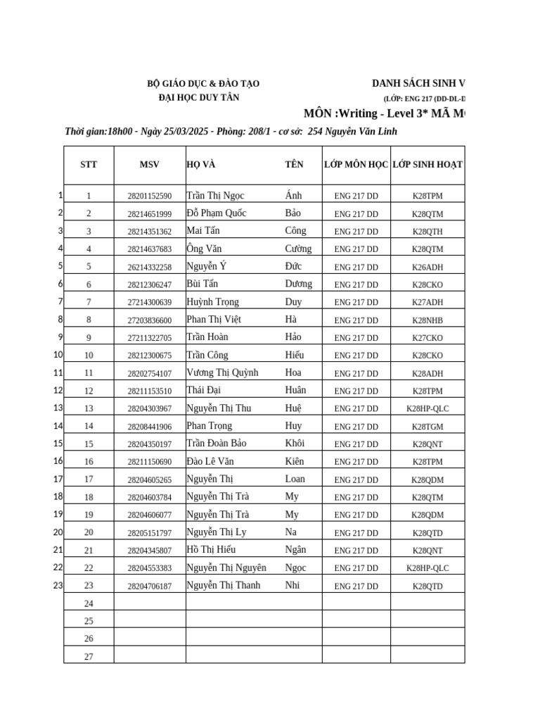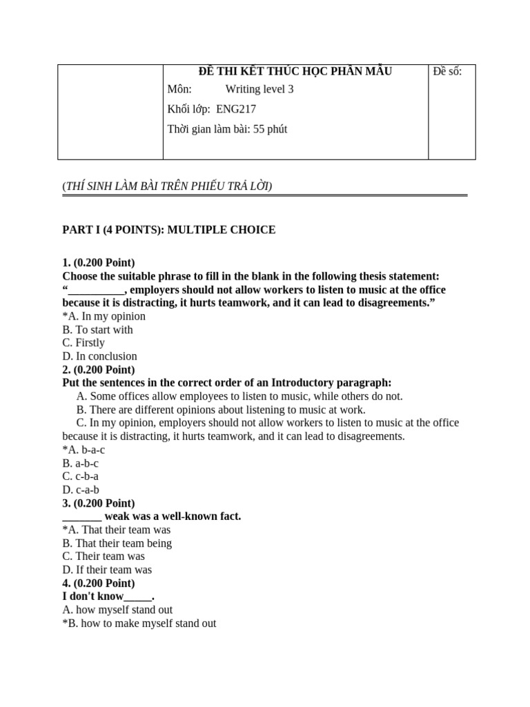 ĐỀ THI KẾT THÚC HỌC PHẦN - Writing Level 3 - ENG217 - HK 1, Năm Học ...