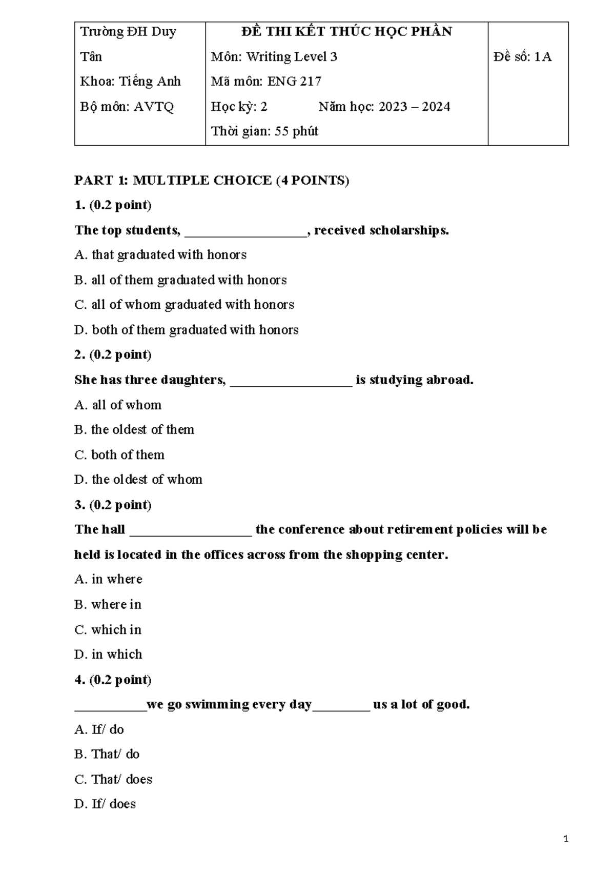 KEY của ENG217 - 1A - aaaa - PART I: MULTIPLE CHOICE ( 4 points) Choose ...
