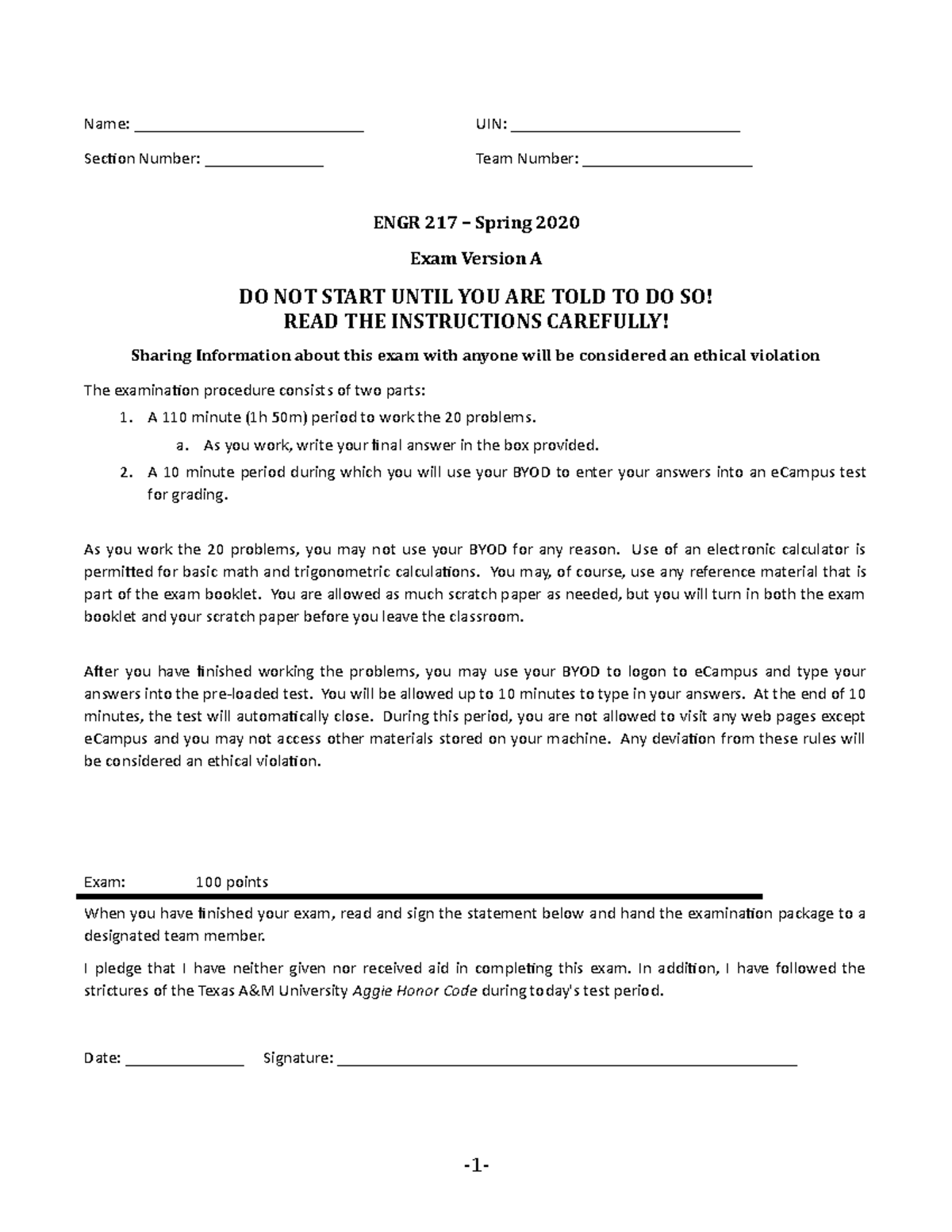ENGR 217 Final Exam S20 Ver A answer key - Name ...