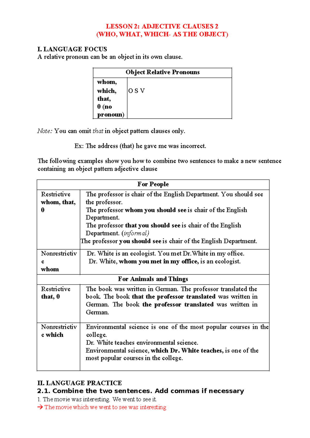 Lesson 2- ENG217- KEY - LESSON 2: ADJECTIVE CLAUSES 2 (WHO, WHAT, WHICH ...