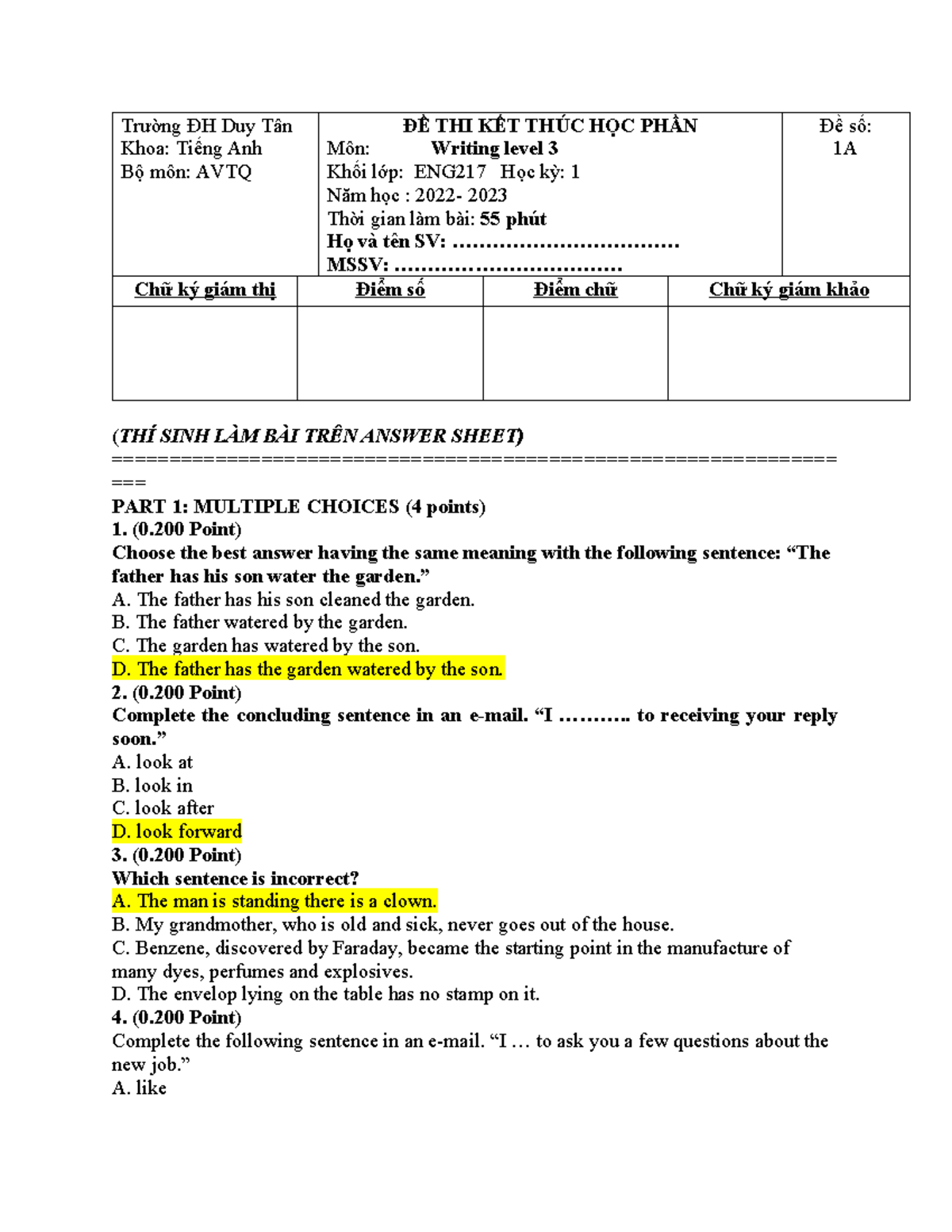 ENG217- Sample Final TEST 1- KEY- SEND SS - BÀI ÔN TẬP PART 1: MULTIPLE ...
