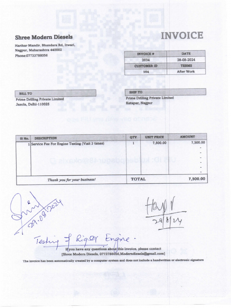 Invoice For Engine Testing Rig 501 - Shree Modern Diesel | PDF