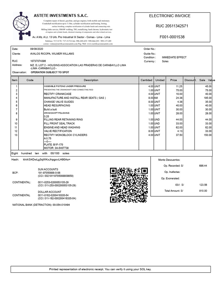 Astete Investments S.A.C.: Electronic Invoice RUC 20511342571 F001 ...