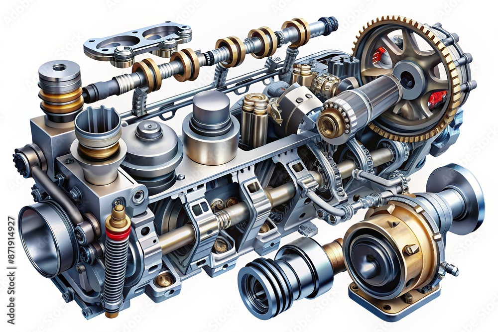 Illustrate a detailed breakdown of an engine, showing individual parts ...