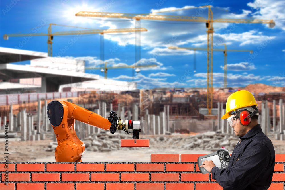 Engineer control working of bricklayer robot working for building brick ...