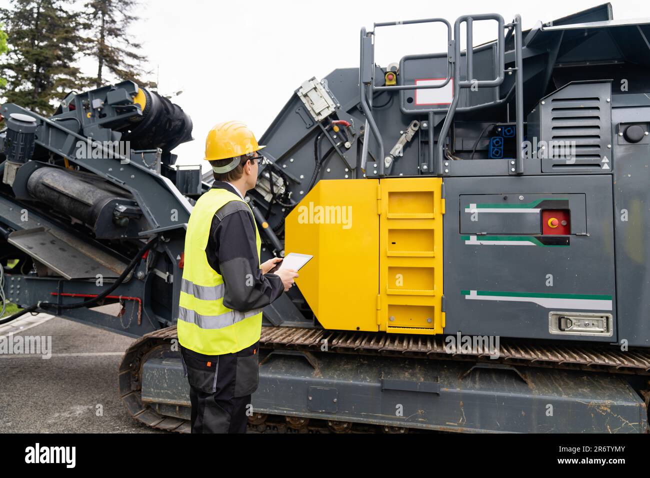 Engineer using tablet working on construction heavy machine background ...