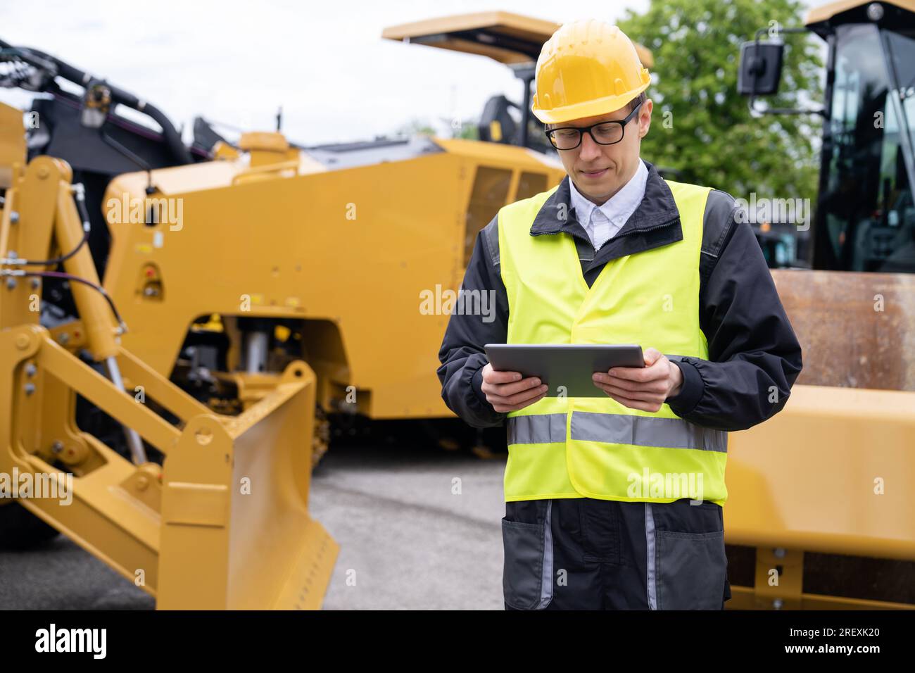 Engineer with digital tablet next to construction excavators | Premium ...