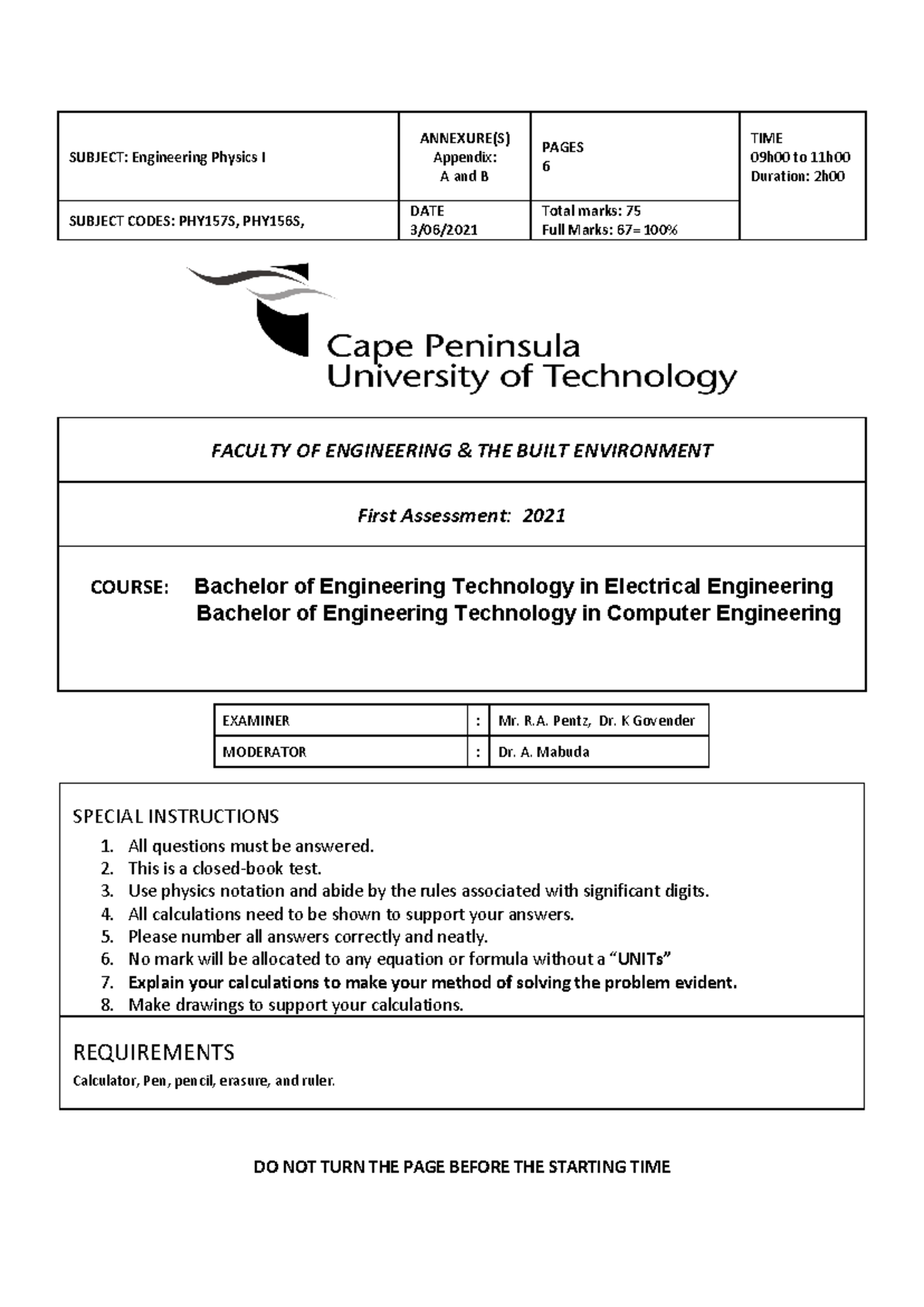 Engineering Physics I Test 2021 - PHY157S, PHY156S - Studocu