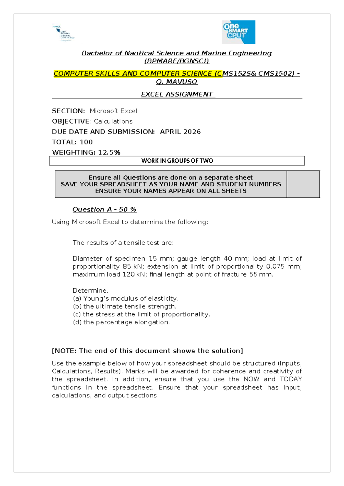 CSM152X CMS1502 Excel Assignment: Engineering Calculations - Studocu