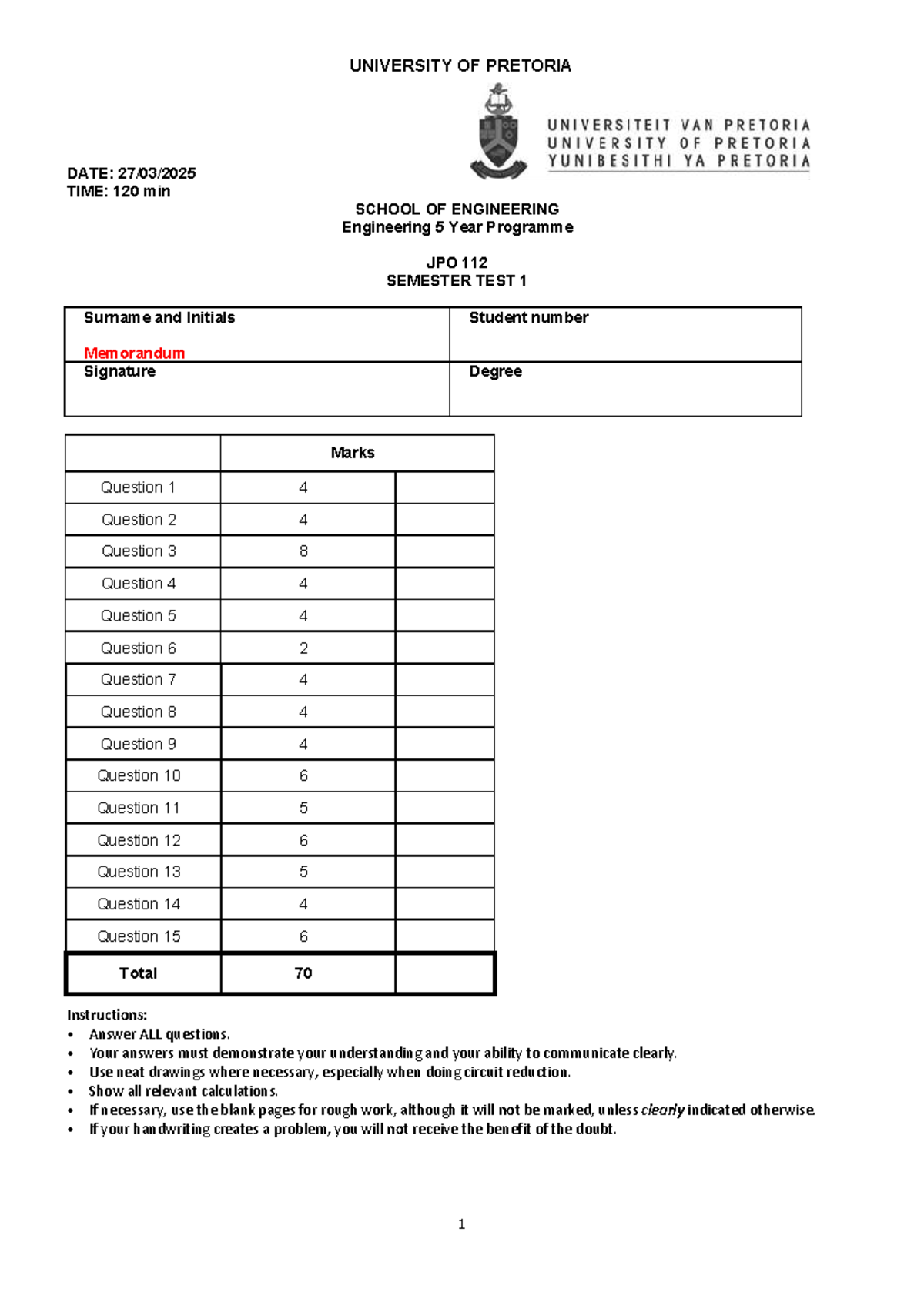 JPO 112 ST 1 2026 Memorandum: Engineering Semester Test Solutions - Studocu