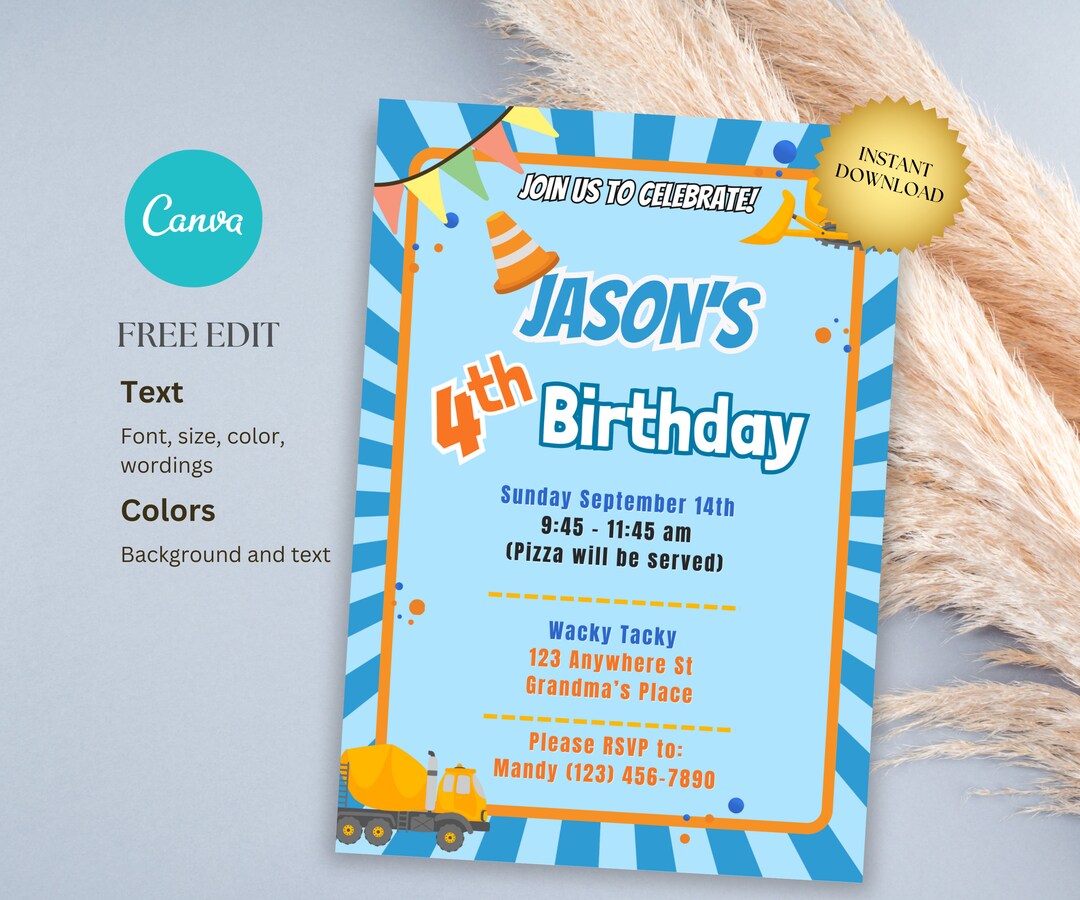 Construction Birthday Invitation Editable Template for Boy and Girls ...