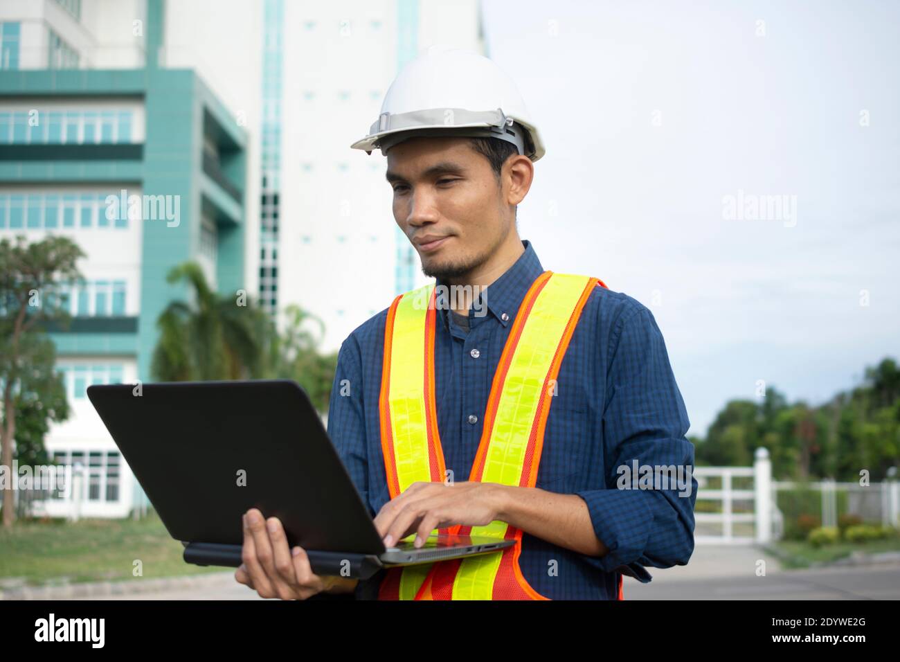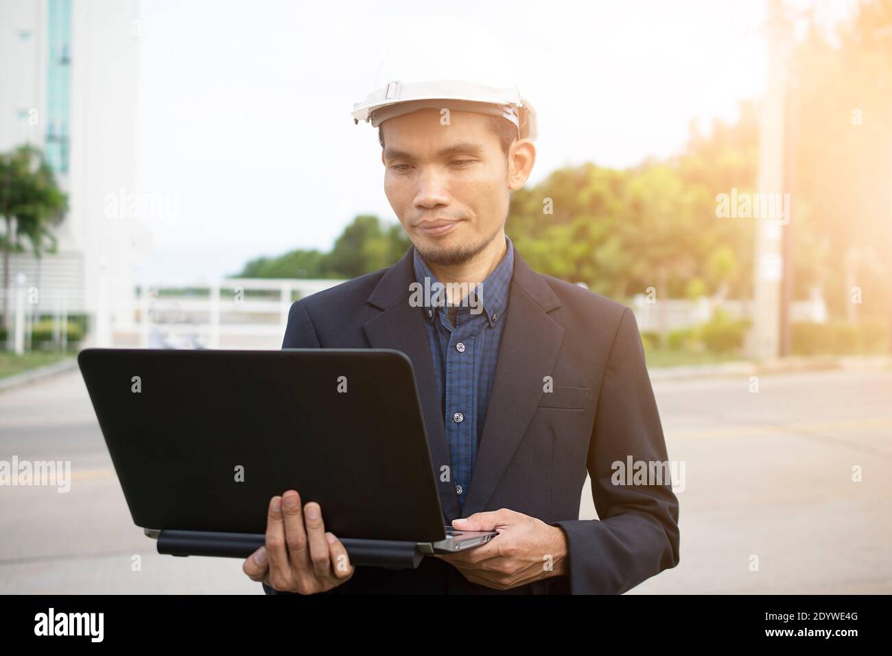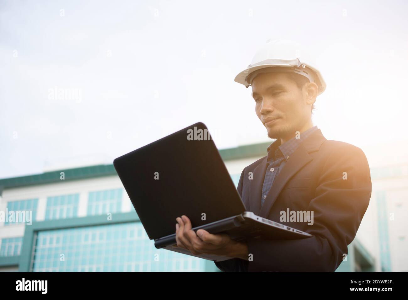 Engineer while holding using Laptop and head wear white safety helmet ...