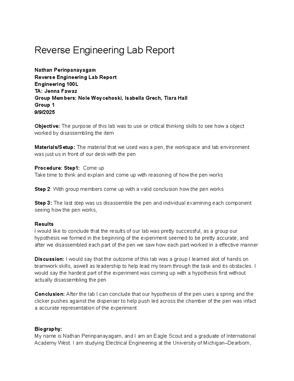 Engineering 100L: Reverse Engineering Lab Report on a Pen - Studocu