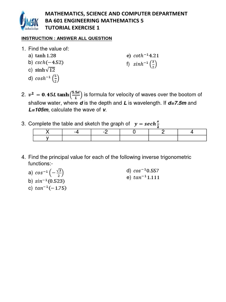 Tutorial Sheet 5 - Questions - MTH155S DEPARTMENT OF MECHANICAL ...