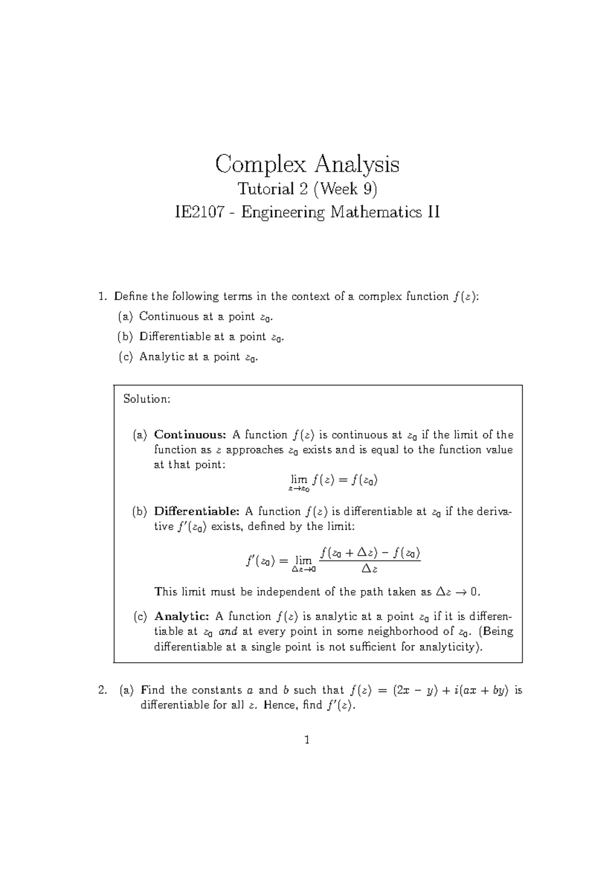 IE2107 Engineering Mathematics II: Complex Analysis Week 9 Solutions ...